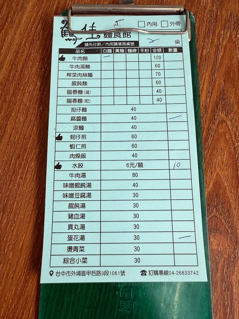 台中外埔小吃店鶴佳麵食館,以諧音梗好吃吸引到我們,環境傳統簡約,份量十足,價格實在,餐點的選項有牛肉麵、餛飩麵、榨菜肉絲麵、麻醬麵、擔仔麵、涼麵、蚵仔煎、水餃,另外還有湯品跟小菜滷味,內用有提供免費飲料。